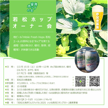 地ビール「Hibiki Fresh Hops 若松エール」の原料となる“ホップ”を育てる過程(苗の株分け、植付、除草、収穫等)が体験できる制度を創設しました。 詳しくはこちらをご覧ください。